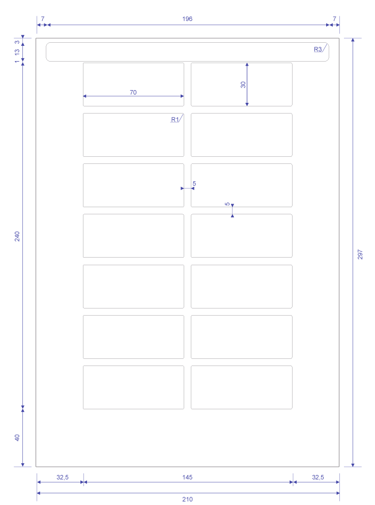 Размеры(в x д): 30мм x 70мм Область для надписи 28мм x 68мм Формат листа: А4 Количество на листе 14 Материал: Алюминий Форма: Прямоугольник Цвет фона: белый Цвет надписи: зависит от принтера -