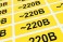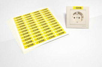 Наклейки для маркировки розеток желтого цвета «~220В», лист 50 шт.