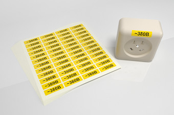 Наклейки на розетки «380В» производятся из желтой глянцевой самоклеющейся пленки. Размер наклейки на розетки «380В» (ВхШ) 11х35мм подобран с учетом приклеивания на рамку розетки большинства производителей. Наклейки предоставляются на листах в подрезанном виде с толщиной наклейки в 200 микрон, что позволяет их легкому извлечению с листа. На листе находится 50 наклеек уже готовых к использованию.