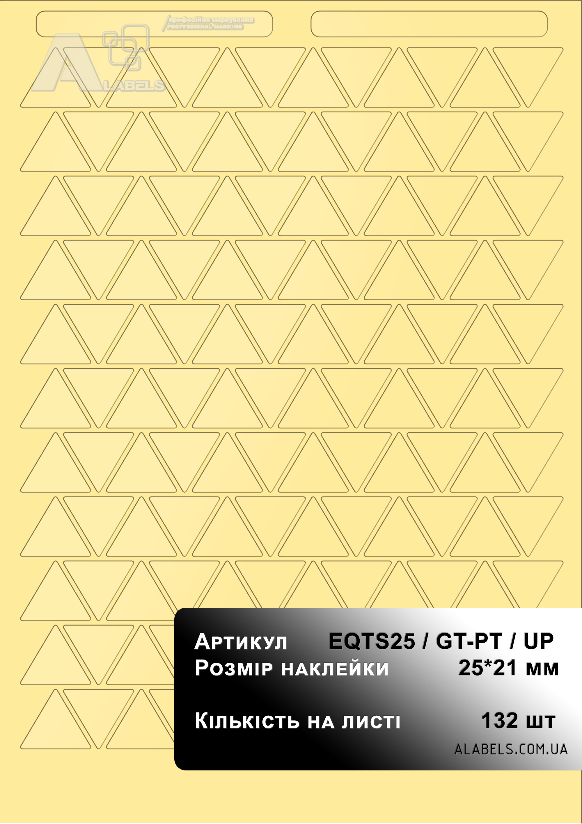 Размеры(в x д): 25мм x 21мм Область для надписи 0мм x 0мм Формат листа: А4 Количество на листе 132 Материал: Винил Форма: Треугольник Цвет фона: Прозрачный Цвет надписи: -