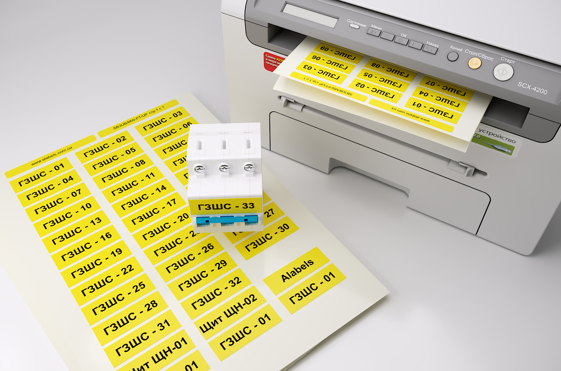 Наклейки желтые под печать на лазерном принтере для маркировки силовых автоматов в 3 U