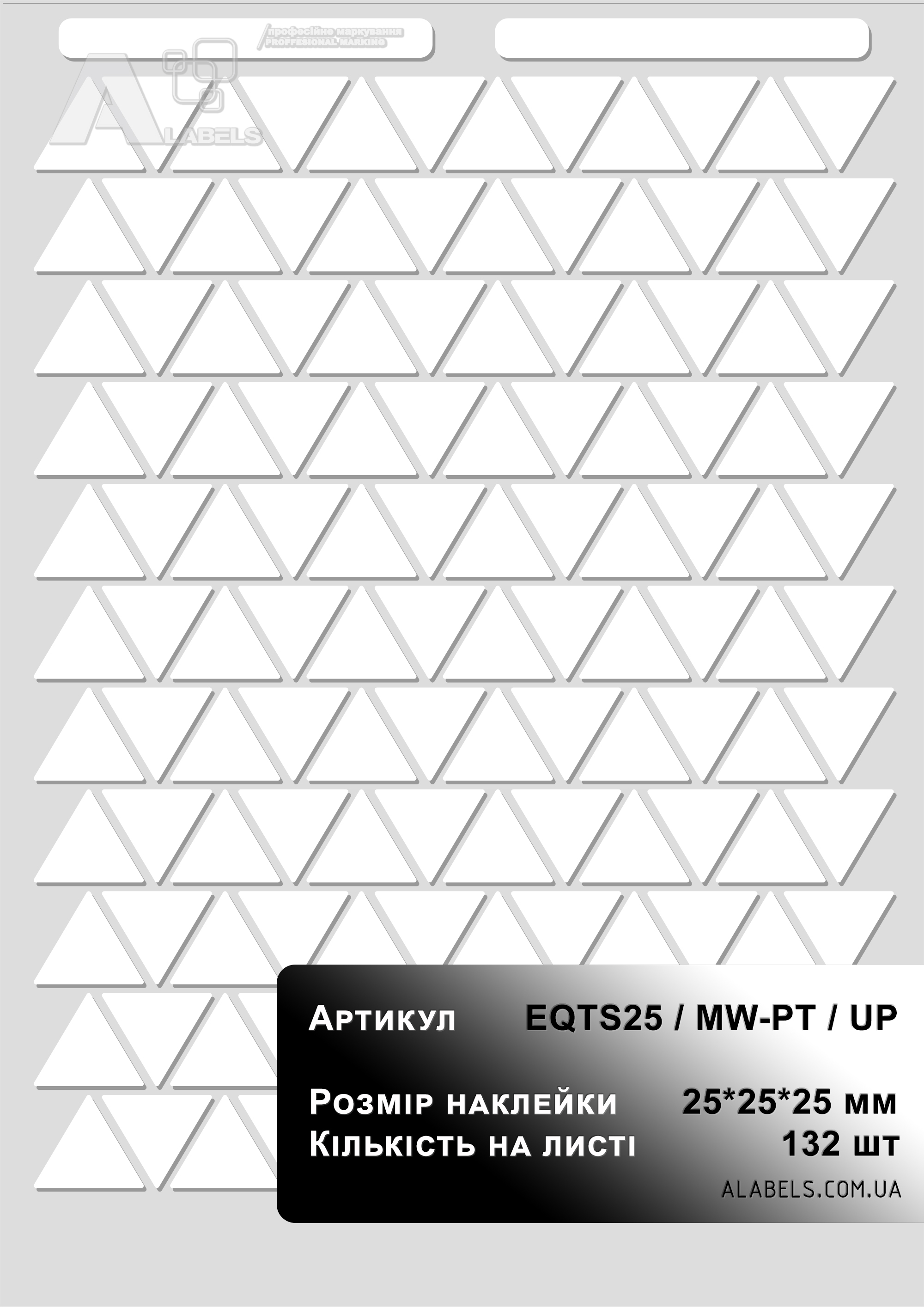Размеры(в x д): 25мм x 20мм Область для надписи 0мм x 0мм Формат листа: Поштучно Количество на листе 56 Материал: Винил Форма: Треугольник Цвет фона: Цвет надписи: -