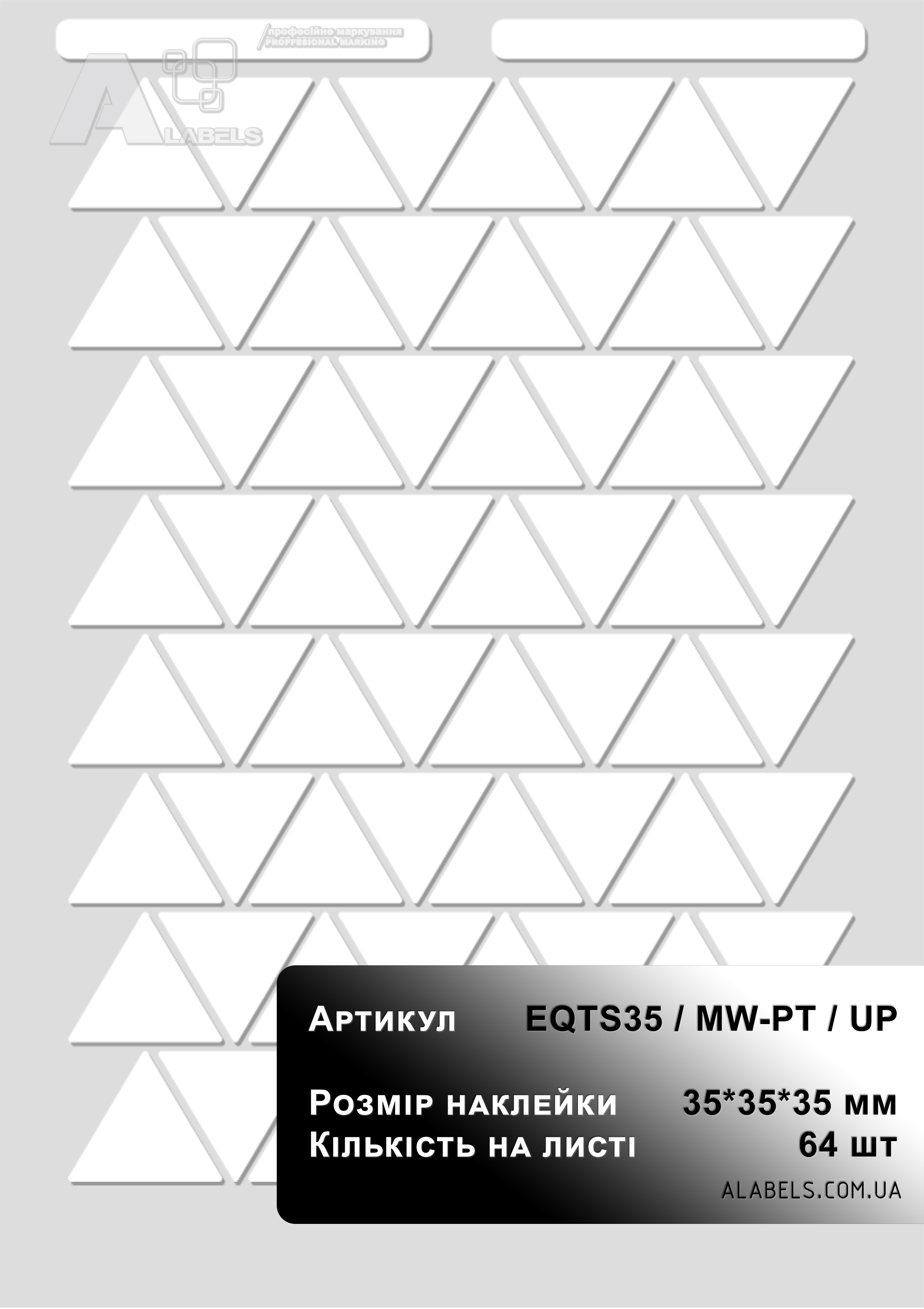 Размеры(в x д): 35мм x 35мм Область для надписи 0мм x 0мм Формат листа: Поштучно Количество на листе 30 Материал: Винил Форма: Треугольник Цвет фона: Цвет надписи: -